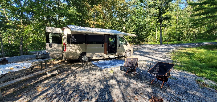 First nights stop was Cowan’s Gap State Park in the Blue Mountain area of Pennsylvania. Situated almost at the top of ridge along a creek with a small lake, it was a very pretty campsite for our first night albeit with no cell phone coverage. After the suffocating heat / humidity of the days prior to leaving, snuggling under blankets due to the drop in temperature following tropical storm Ida was a pleasant relief.