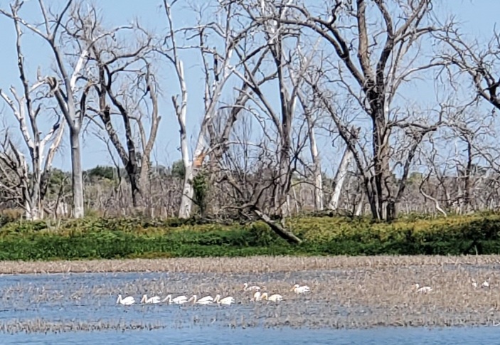 The surprise of the day was this spotting of the American White Pelican at our lunch stop on a dammed up river. We don’t have our wildlife photography equipment handy yet, so these are cropped images from my phone.