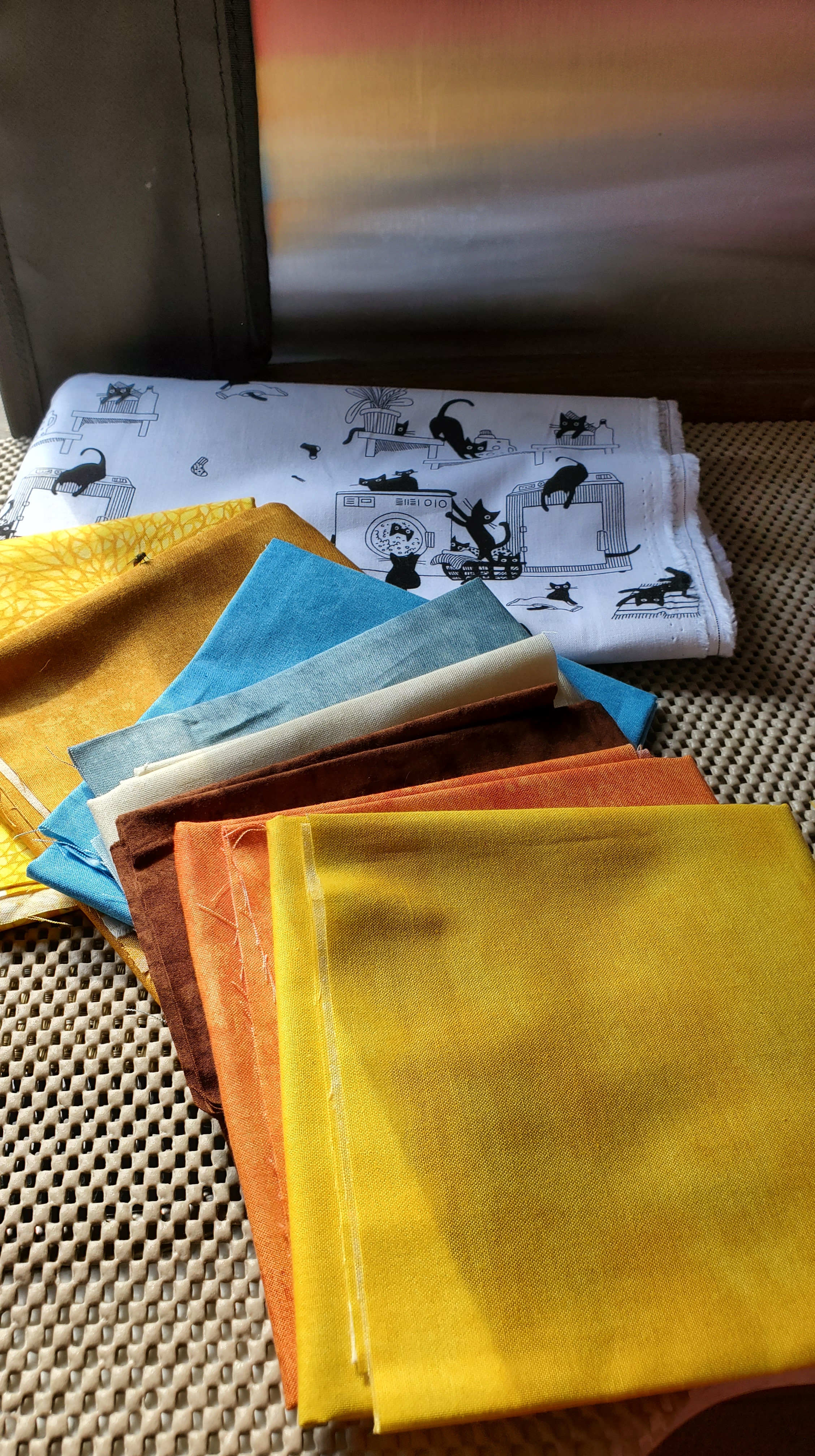 I did find another quilt shop in Alexandria so we took a slight detour off I94. It also gave us an opportunity to check email, make a couple of appointments and get gas. This quilt shop specializes in cat themed fabrics. I want to make at least one block of my now to be trip themed quilt to reflect the colors of the landscape in the Dakotas – deep yellows, oranges, brown, sage and sky blue. This shop had all those colors in fat quarters so I can now say I bought them on the trip even though we are in Minnesota.
