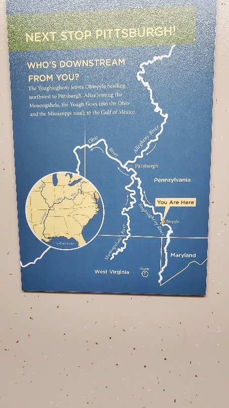 After Kentuck Knob we headed back to the town of Ohiopyle on the Youghiogheny R., very near our campgrounds. It is a mecca for river rafting, hiking and cycling. We stopped for a lunch of chicken wings and fries then walked along the river to the falls and the visitor center.