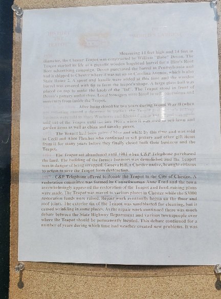 The Teapot stands on a manicured lawn between elevated US 30 and its Chester exit ramp. It is 12 feet high, 44 feet wide, and was originally built as a giant keg by Hires Root Beer. It was originally brought to Chester in 1938 to represent the largest pottery industry in the world at that time. The teapot was originally a Hires Root Beer sign in the shape of a large barrel and was converted into a teapot upon its arrival in Chester. The teapot underwent restorations in 1990 and 2007 by the citizens of Chester. By coincidence Charles Elmer Hires‘ root beer may also have had its inspiration in a kind of herbal tea.
