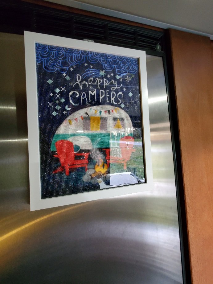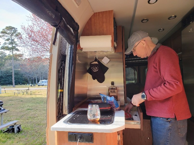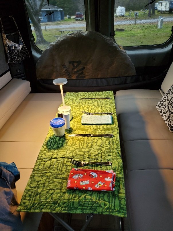 Van modifications for this trip: we keep adjusting and streamlining without doing a whole lot of structure changes. The main elements this time were the installation of door stoppers on the bathroom doors ( no more bungee cords to keep the doors open) and a shelf across the back where I now have small baskets for storage. Just those two things alone make a huge difference in usability and space saving. I also made hanging bags for the wardrobe that doesn’t get used as a wardrobe, therefore utilizing space without installing shelves. We also purchased an Alvantor 6×6 screened dining shelter that is supposed to be easy to put up and take down. We have yet to do that… once we get below the ‘gnat line’ it will come in handy. The gnats were ferocious last year so hopefully this will help.