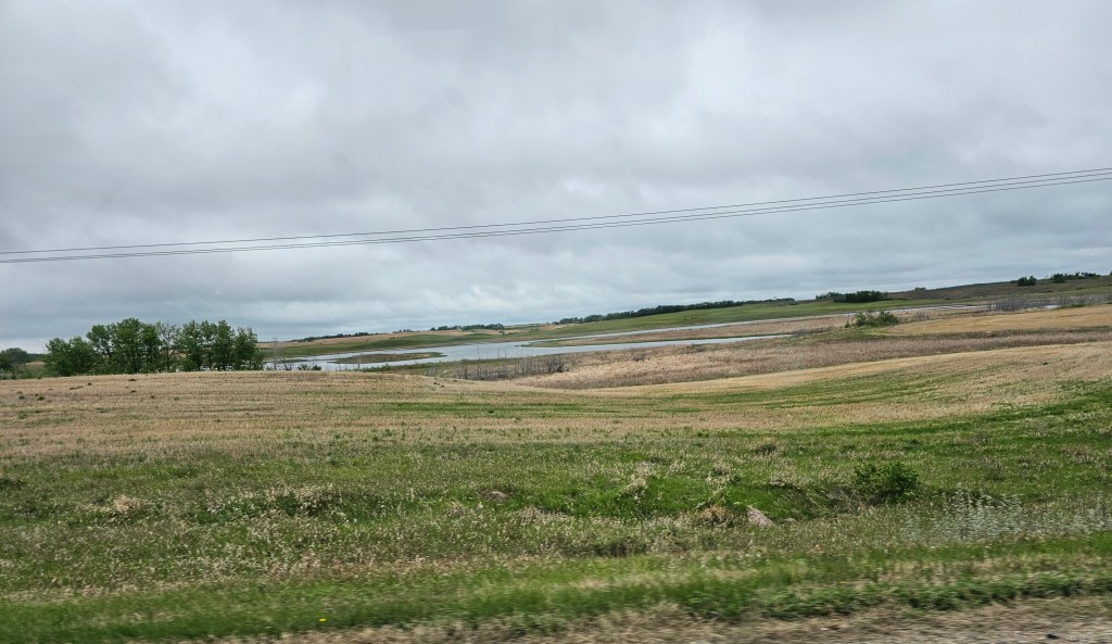 The topography is much greener and hillier with more trees and sloughs than I had expected. My father talked about the Saskatchewan sloughs ( pronounced ‘slew’) but I had no idea there were so many of them. The larger ones had waterfowl in them mainly ducks and geese and white pelicans in the lakes. Topography flattened out closer to Saskatoon as we drive west.