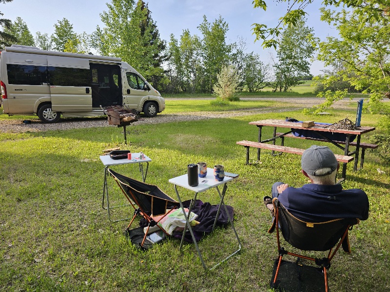 We were debating about spending the night in a hotel as a change of pace (and the promise of a nice long shower) somewhere in the Battlefords about 2 hours west of Saskatoon but the sun has finally come out and it seems we will have a nice evening to spend outside. Also we have leftovers in the fridge we need to clean up. It actually takes more work to move into a hotel than it does to set up camp. We found a decent campground just east of North Battleford and there is almost no one here and very few bugs.