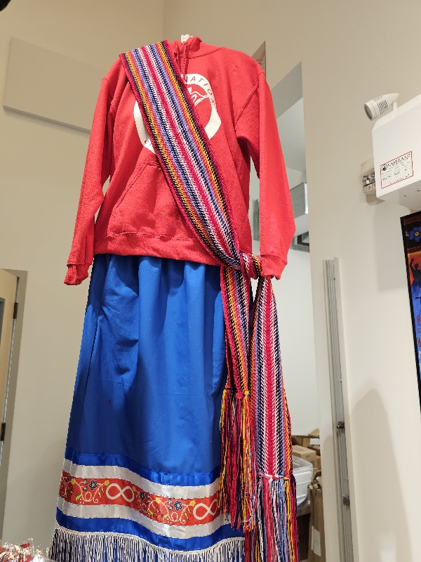 The ceinture fléchée or L’Assomption or arrowed sash is a type of colourful sash, a traditional piece of Québécois clothing linked to at least the 17th century. The Métis also adopted and made ceintures fléchées and use them as part of their national regalia. Typical sashes are about 25cm (12 inches wide) and can be 2 m. (2 yards) long and were originally used by the French voyageurs to keep their woolen coats closed in the winter. The Metis used the sash as a belt to hold coats closed, and also as a towrope, tumpline, towel, and even a sewing kit.