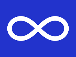 The flag shows a white infinity symbol on a field of either blue or red. There are many interpretations of what the colours and symbol mean.