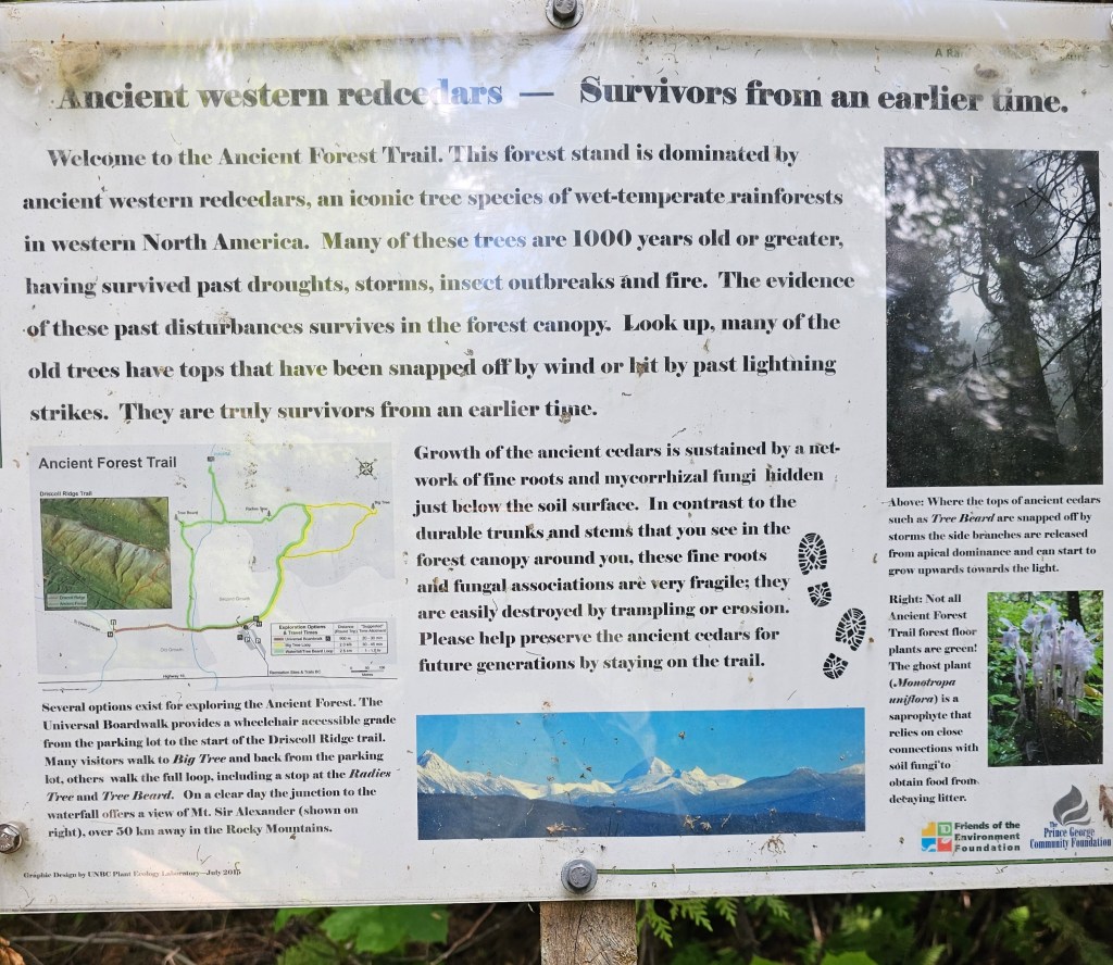 While conducting research of lichen biodiversity, a UNBC graduate student came across the impressive stand of western red cedar trees. Forestry was and continues to be a prevalent industry in the north; at that time, these same trees were flagged and designated to be logged. Recognizing the vital importance of the Ancient Forest to the local First Nations and the unique ecosystem of the area, trails were soon developed to bring visitors to the site not only so others might see the majestic cedars, but bring attention to the site so that it might be protected.