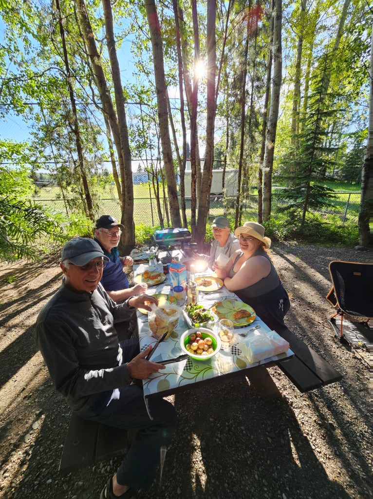 It was a beautiful sunny day, not particularly hot, but pleasant enough to have everyone back to our campsite for dinner. It’s the first time we have entertained! figuring out how to coordinate dinner for 5 when everything is set for 2 was a challenge. And it was a great meal: salmon on the BBQ, small potatoes in our toaster oven, broccoli in the microwave, big green salad and butter rolls. Watermelon and cookies for dessert and a bottle of rose π·. We even had a campfire.
