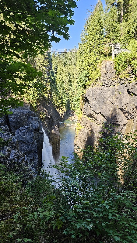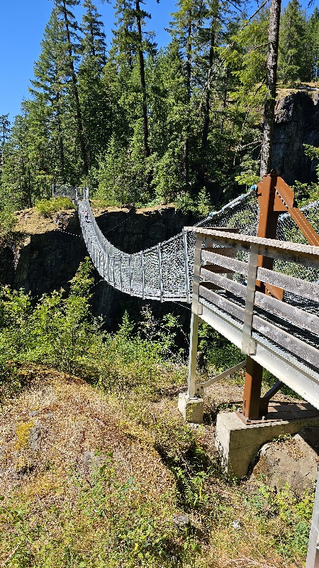 Elk Falls Provincial Park is in a stand of very old cedars and redwoods. We walked for about an hour (in my new sandals) to view the falls and walked across the suspension bridge.