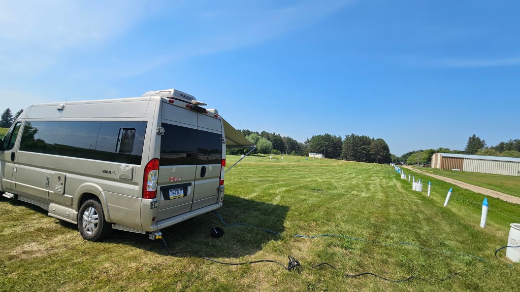 It was hot when we set up camp. We are in a grass field all by ourselves. We just found the fattest spot near water / electricity. Since no one is here but us, we took advantage of the situation and used our outdoor shower! What a treat.