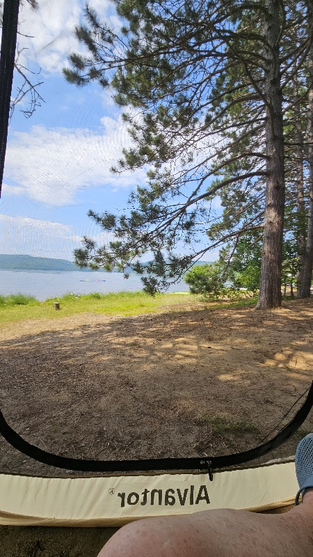 It’s hot. Hmm. This park has horse flies and Deer flies, both of which like water and human flesh. We have both. Into the bug tent we go after our swim.