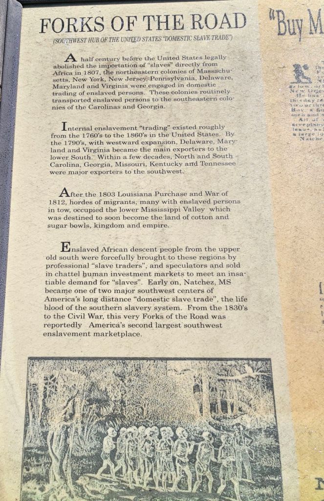 The site got its name due to its location at the intersection of two major roads that led to the city of Natchez. From the early 19th century until the Civil War, Forks of the Road was a significant hub for the domestic slave trade, with thousands of enslaved people being bought and sold at the market.