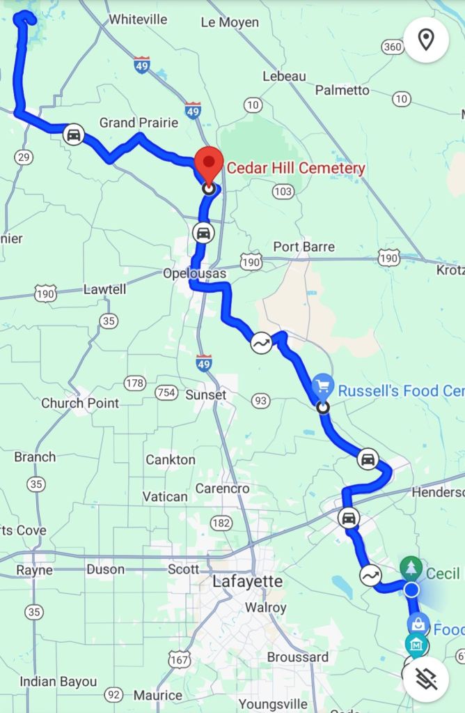 Starting with Chicot Bayou, we drove through Ville Platte, Washington, Opelousas, Arnaudville, Breaux Bridge, Parks, St. Martinville.
