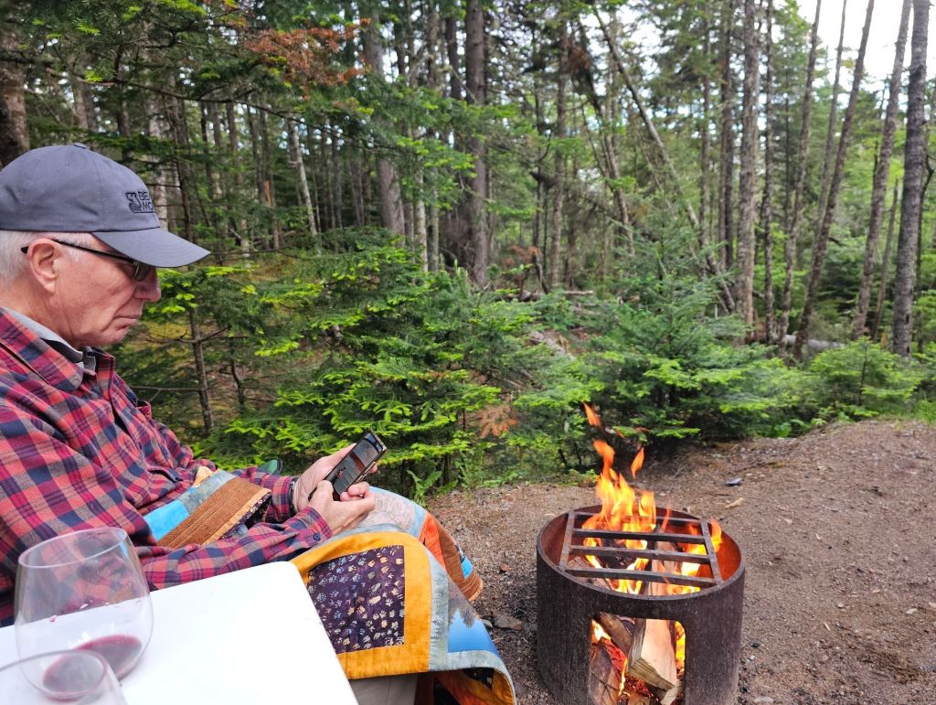 Our campground for tonight is a Provincial Park on the shores of the Bay of Fundy between St. Stephen and Saint John. The temperature dropped 12 degrees from a comfortable 70 F to a decidedly cool 58 f. We bought firewood!