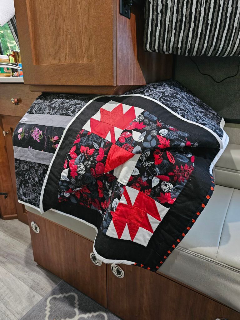 I have our travel quilts with us for cool evenings. Brian’s is the Yellowstone quilt I made with fabric purchased on our first trip west in the van in 2021. Mine is the Canada 🇨🇦 quilt I made last fall with fabric acquired as we traveled west across Canada.