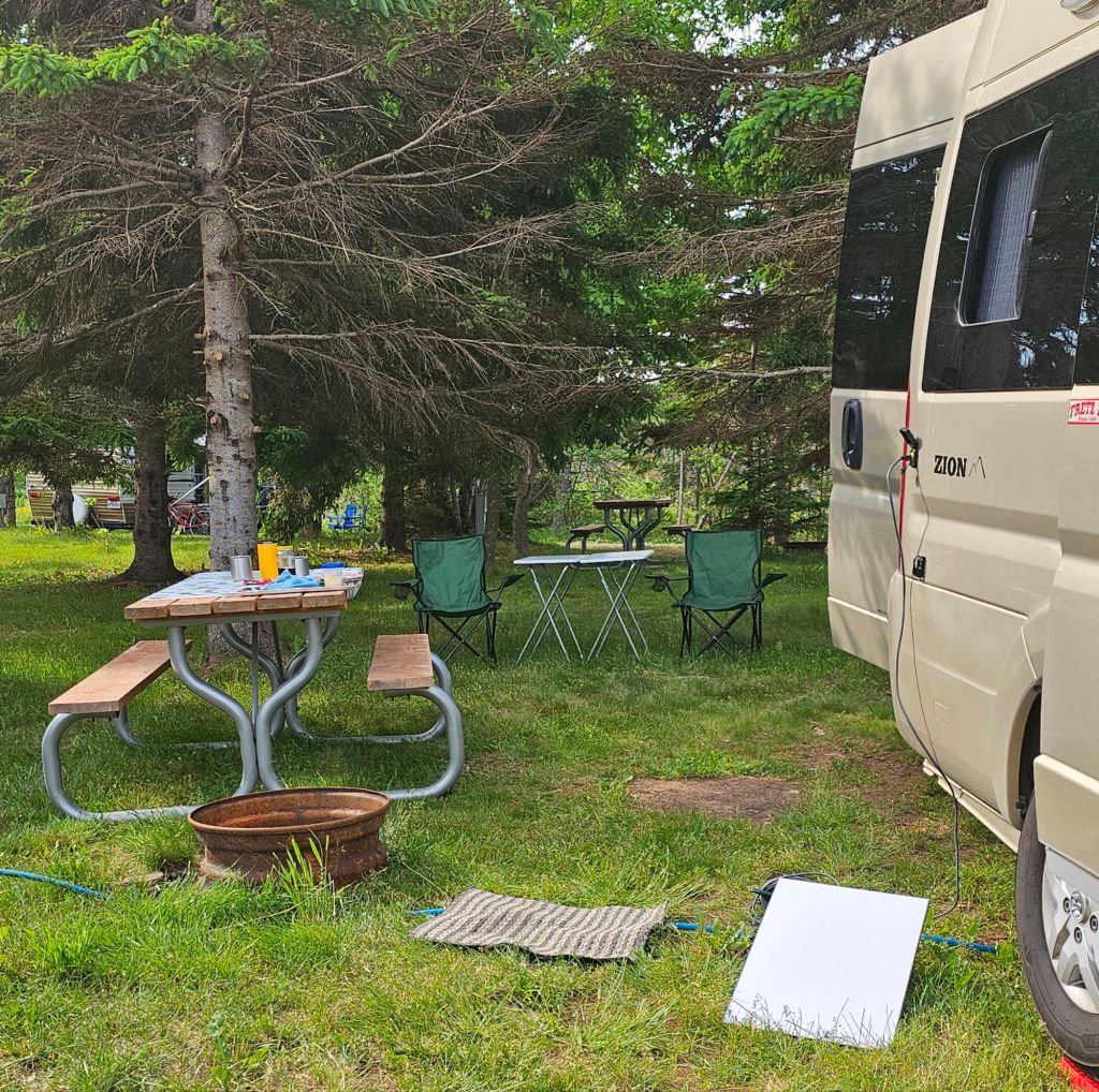 This is our ‘day off’. We booked this site for 2 nights so we could enjoy some time on these beautiful beaches… to walk, not swim. Today the van stays put, no driving, giving me some time to make a campsite look like home (ie put a tablecloth on the picnic table), do some laundry, our weekly clean up etc.