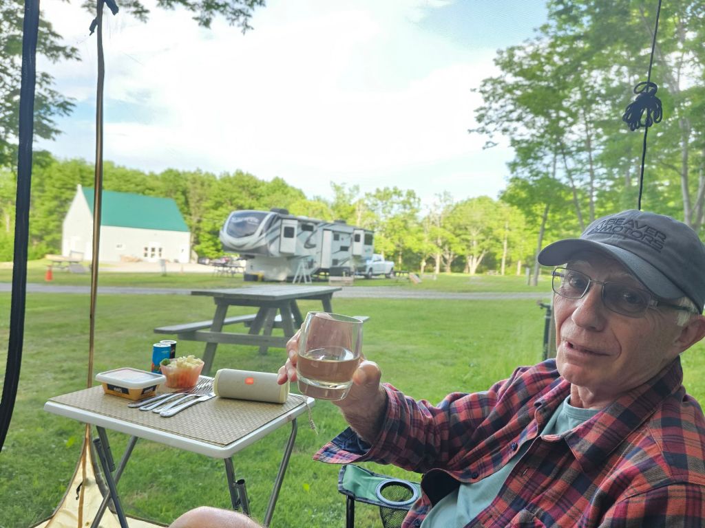 Sitting here in our little bug tent with a glass of wine, some soft music on my phone and my hand sewing. Brian has been chopping up the 2 lobsters we purchased this morning. We don’t exactly have lobster meat retrieval tools so it’s a hammer and a knife! He took his frustration for Marine Atlantic out on the lobsters. Therapeutic and nutitional.