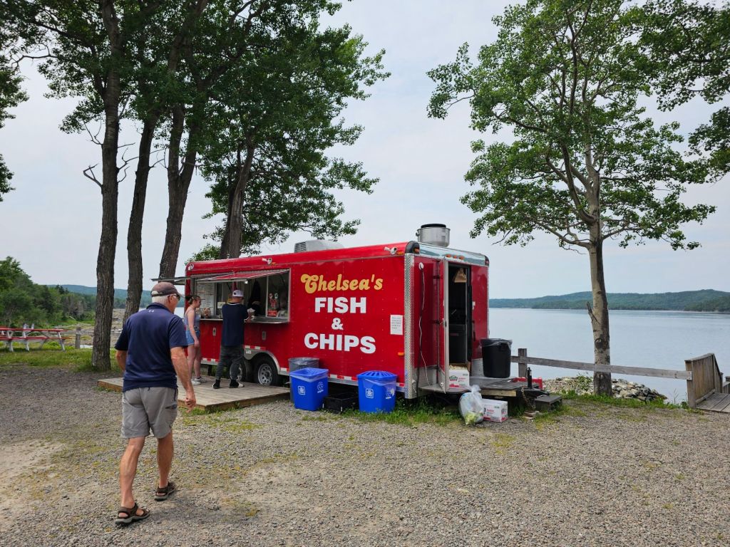 We slowly made our way back to the TransCanada Highway poking in and out of small towns. We stopped at a waterside Fish and Chips truck / Diner for lunch. Great food with an excellent view. Brian had a crab 🦀 sandwich. It was delicious.