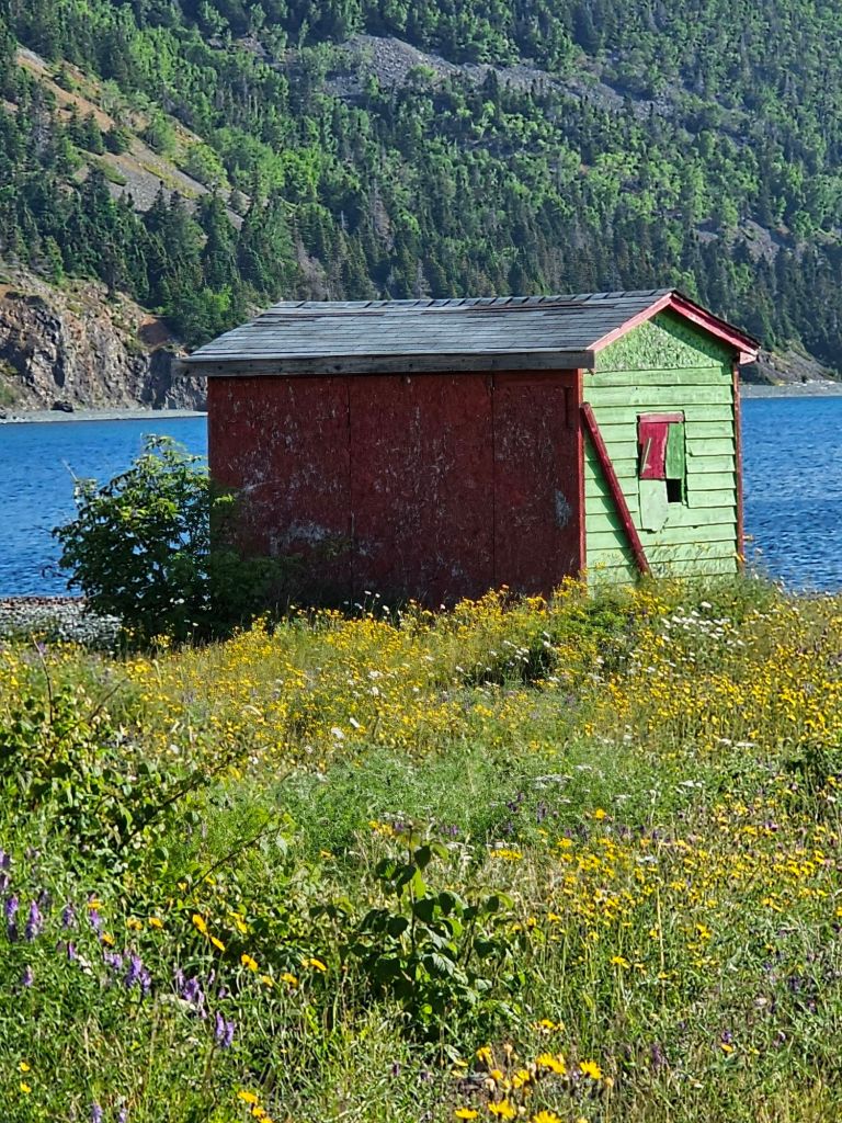 We stopped in Rocky Harbour at the end of Bonne Bay on the north shore. We had lunch at Earle’s Restaurant where I had mooseburger and Brian had Newfoundland fish chowder. Moose is very mild and lean. At the seafood warehouse on the wharf, we purchased frozen Atlantic ocean-grown salmon and shelled lobster meat from the equivalent of 2 lobster. We’ll save that for Labrador.
