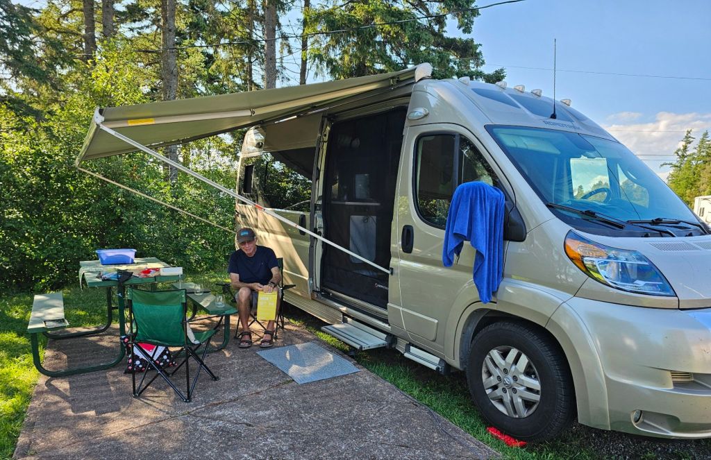We stopped for lunch at a delightful bistro Cafe outside of Truro. We arrived at Loch Lomond Campsite around 3 pm. We have a very pretty partially shaded lottle campsite. We haven’t been able to put chairs out for several days, so this is a real treat. We even extended the awning, something we rarely do. It feels cozy.
