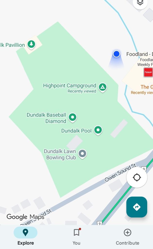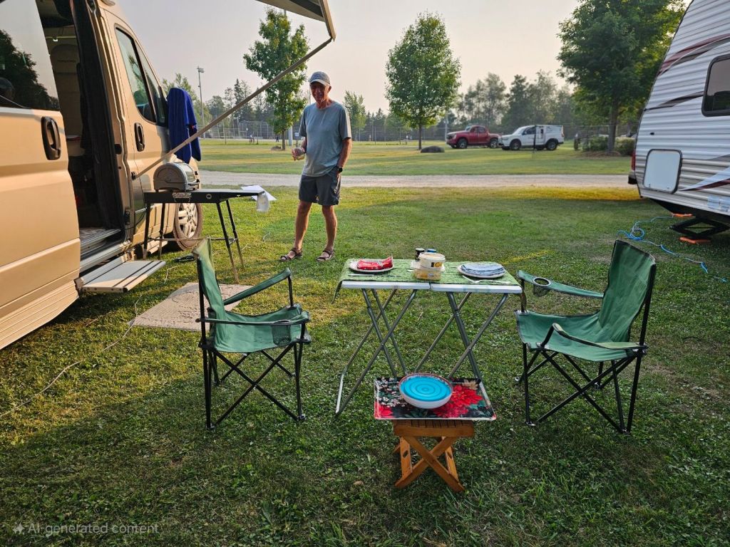 Our campsite tonight is in a community park in Dundalk Ontario. Community parks with swimming pools, baseball diamonds, playgrounds, gyms and hockey arenas etc are a feature of most Ontario communities. This one also has a small campground, brand new washrooms with showers and full hookups. Our campsite was up against the fence facing beautiful gardens. We had a pleasant afternoon and evening here even chatting with our neighbors for a bit.